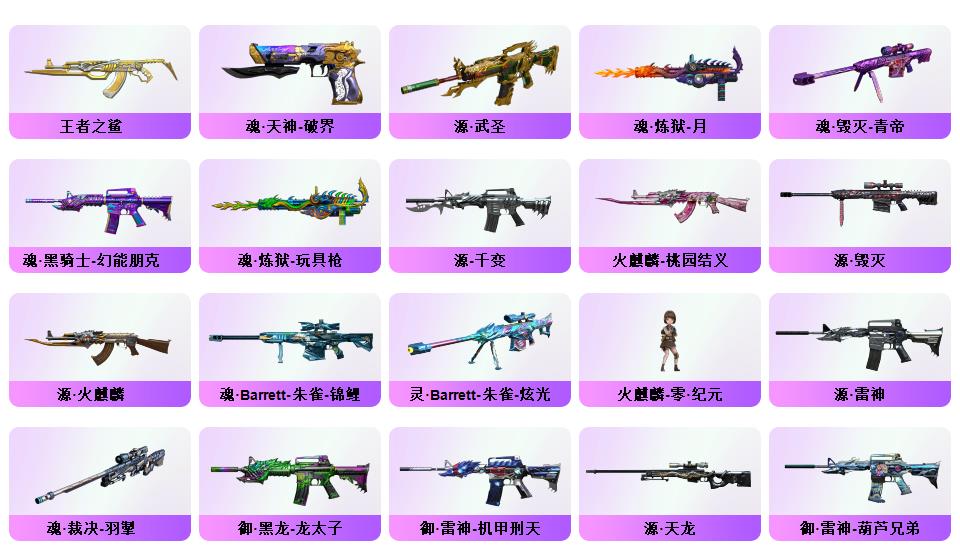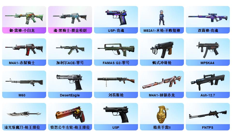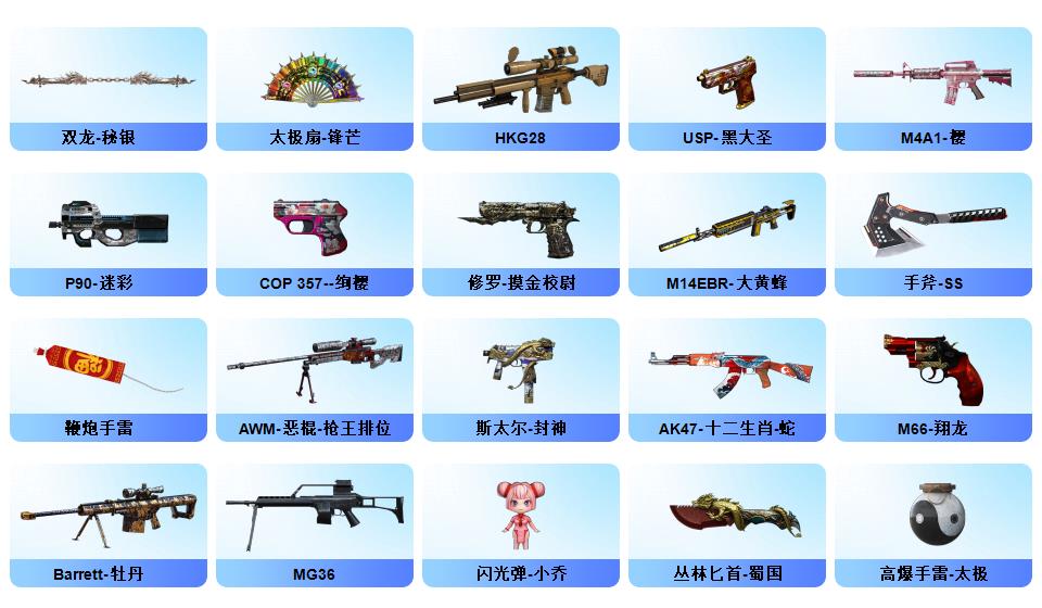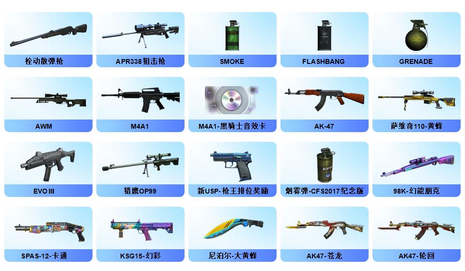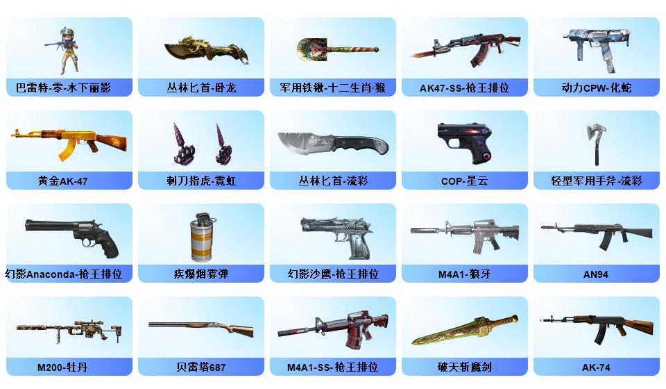 顶级生化双蝴蝶毒蜂清道夫六烈龙小刚六盘龙隼(追踪标志)炽芒蝶刃传说圣灵星神竞技套USP雷暴柯尔特COP机械猎手皮肤圣泉女皇钢铁皮肤