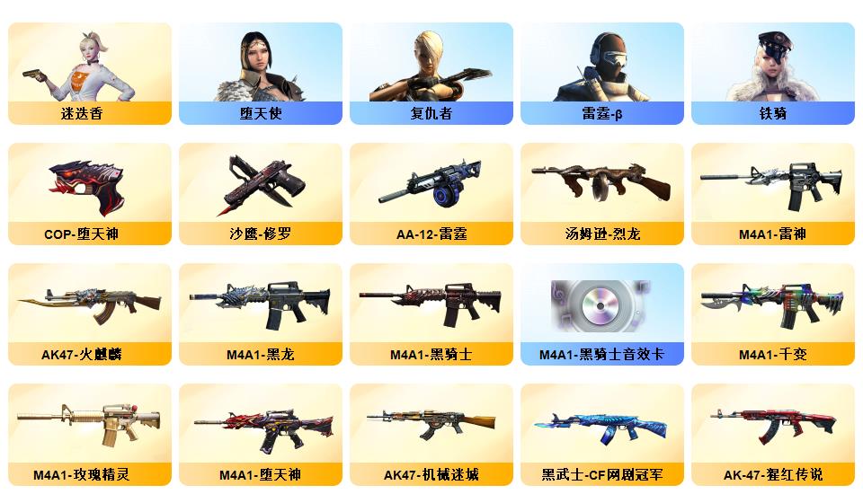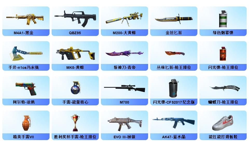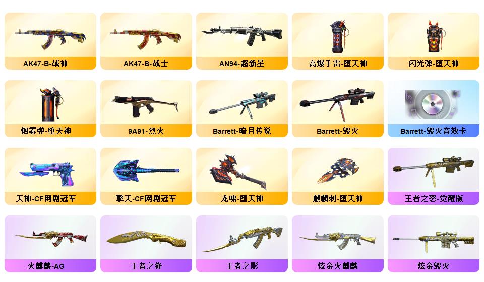 10王者☀毁灭音效卡☀7烈龙☀7副7刀☀CF网剧冠军套☀夜魔套☀堕天使套☀王者炎心☀死亡之眼子弹1000多发