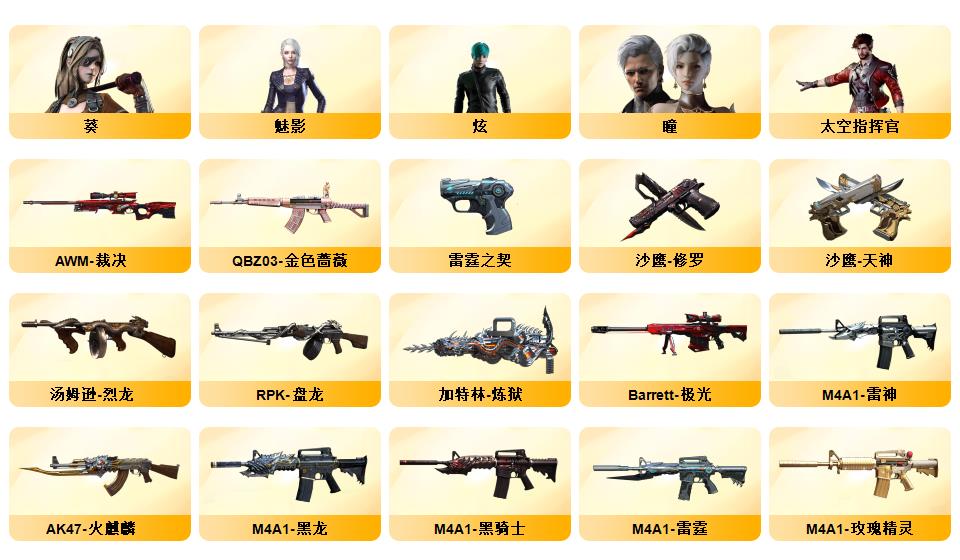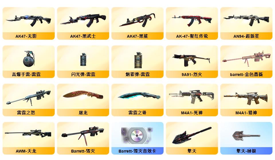 100V星神/六烈龙/生化无需换弹/QBZ蔷薇/白鲨COP/王者春/毁灭音效+雷神音效+极光音效/毁灭耀金/雷神白鲨耀金/火麒麟EVEN+华夏之心+轻羽AG皮肤